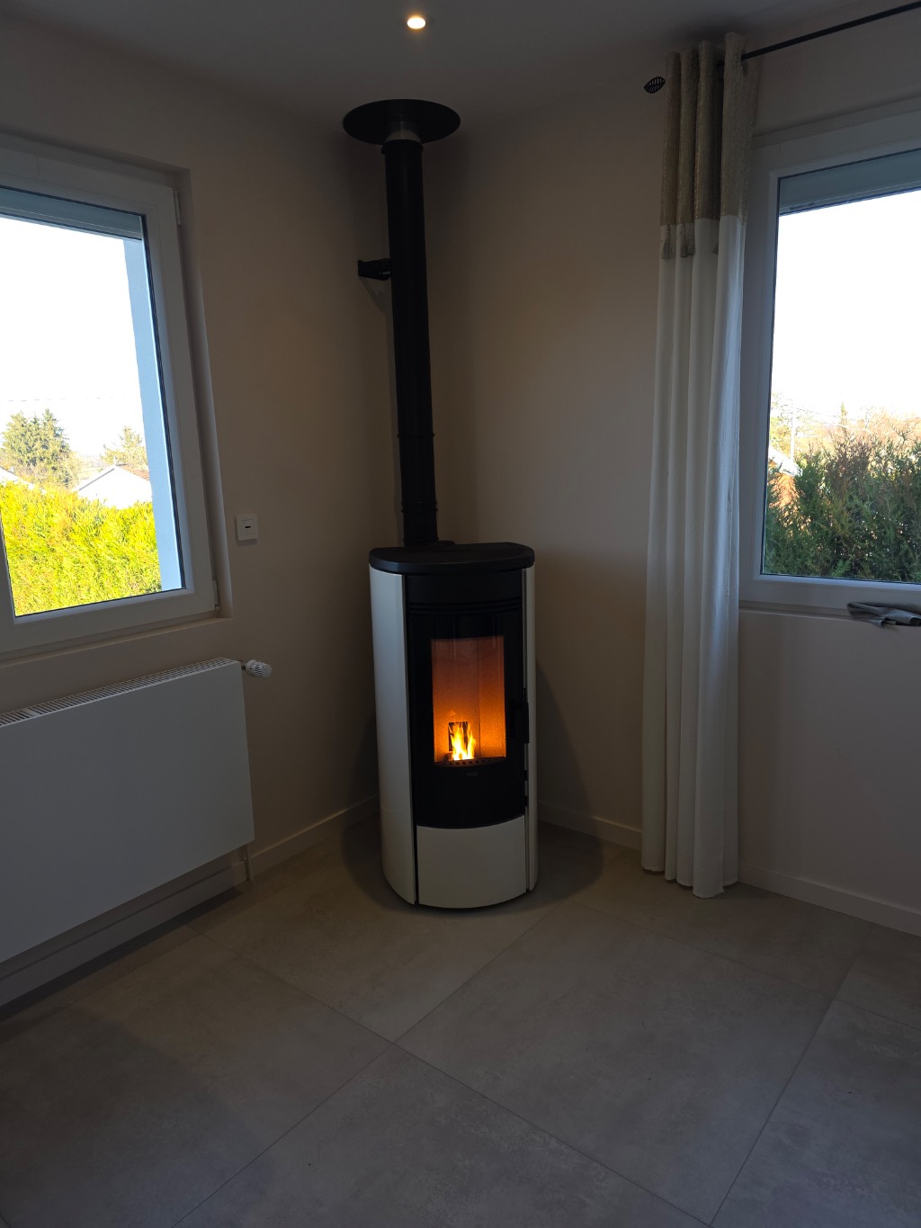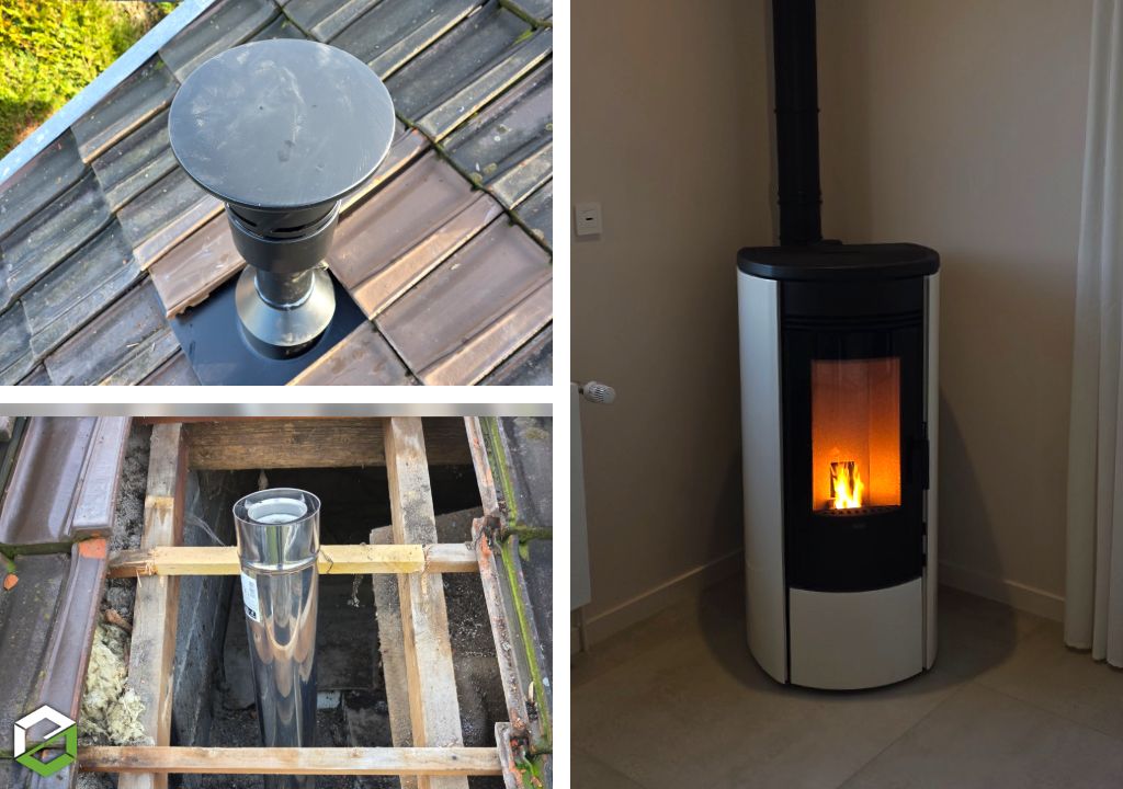 Installation d'un poêle à granule KLOVER 8 kW en complément d'une pompe à chaleur air/eau sur radiateurs de notre cliente. Il permet aussi de chauffer la maison en inter saison.